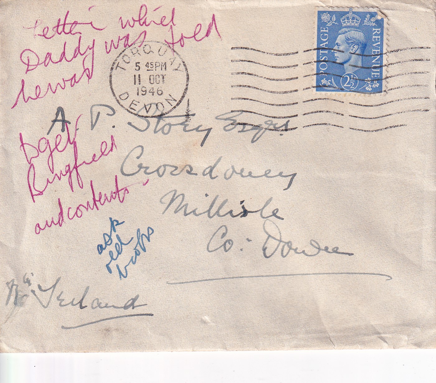 Many thanks to Daisy for her last letter. What storms you were having too in old Ireland, damaging the crops as everywhere, very sad. I do hope you are now having a share of our dry and bright weather.
